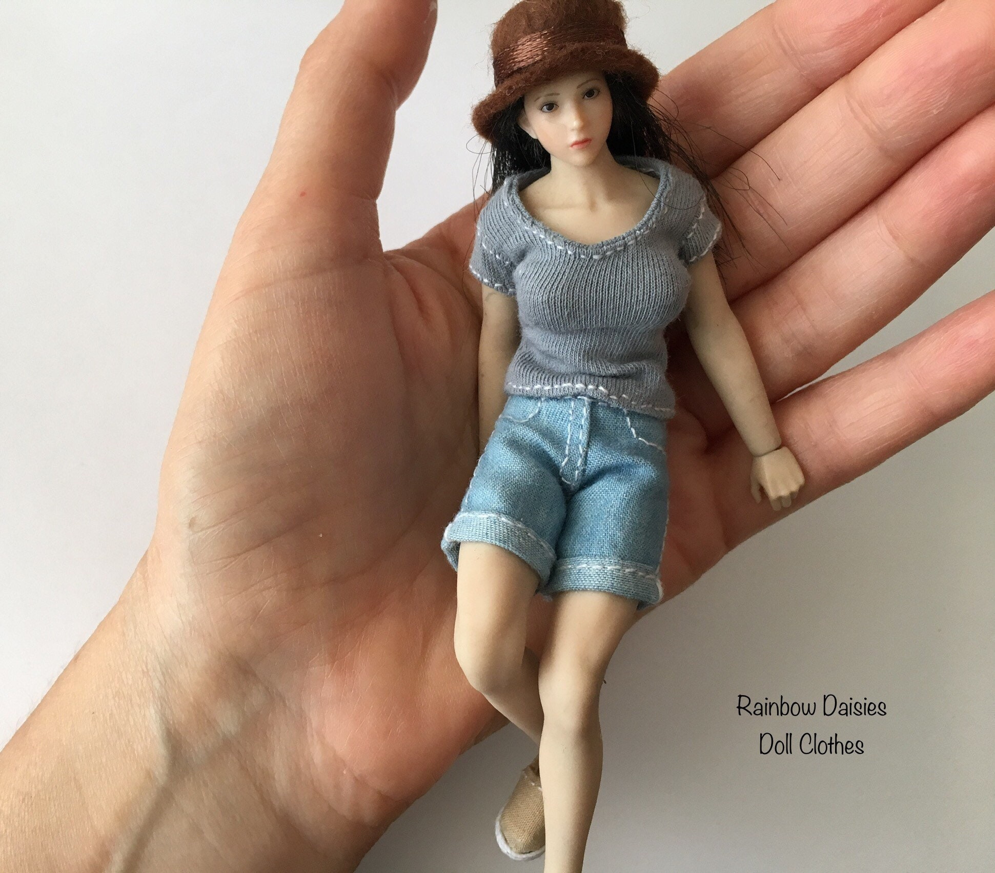 A pair of miniature grey denim pants in 1/12 scale.